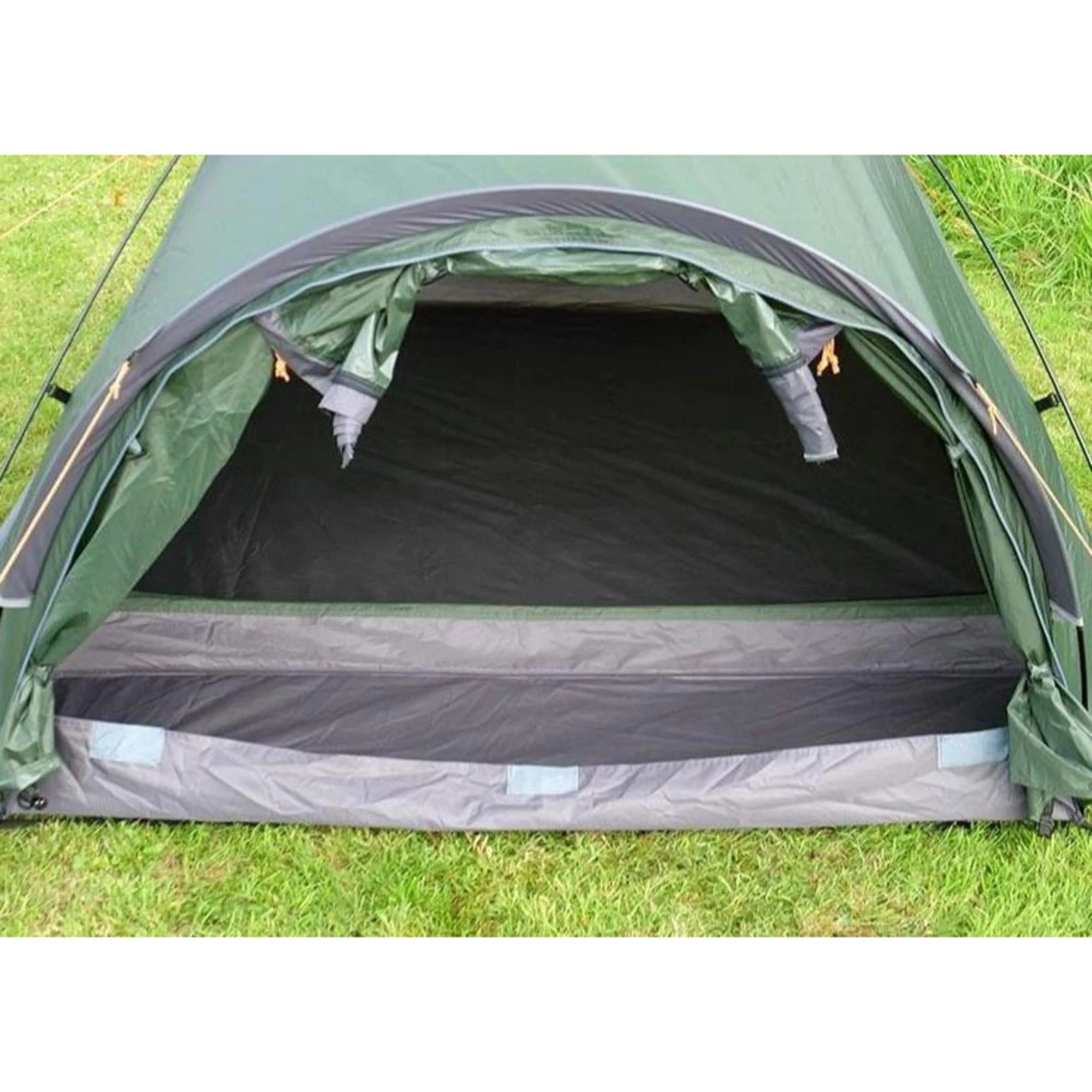 - Außenzelt und Innenzelt werden durch außenliegendes Gestänge gleichzeitig aufgebaut