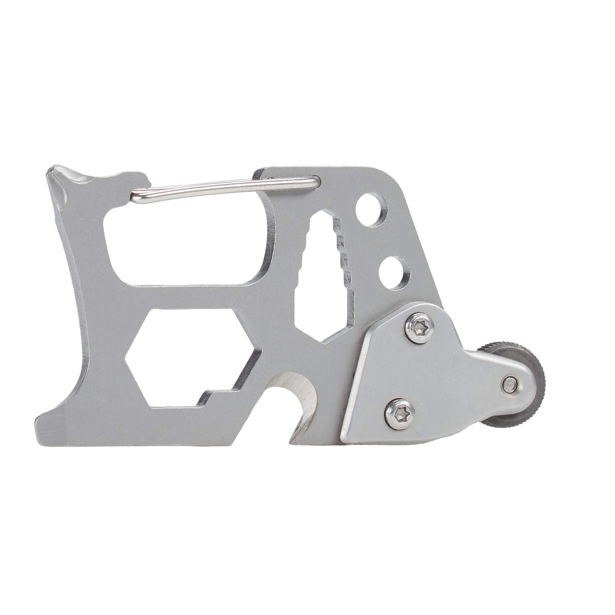 Die Hakenklinge öffnet nicht nur Pakete, sondern ist auch scharf genug, um Bänder und Gurte zu durchtrennen. Kernstück ist jedoch das Reibrad mit Feuerstein, das wie ein handelsübliches Benzinfeuerzeug Funken erzeugt, mit dem du feinen, trockenen Zunder entfachen kannst. Mit dem Karabinerhaken kannst du das Tool am Rucksack oder Schlüsselbund befestigen.