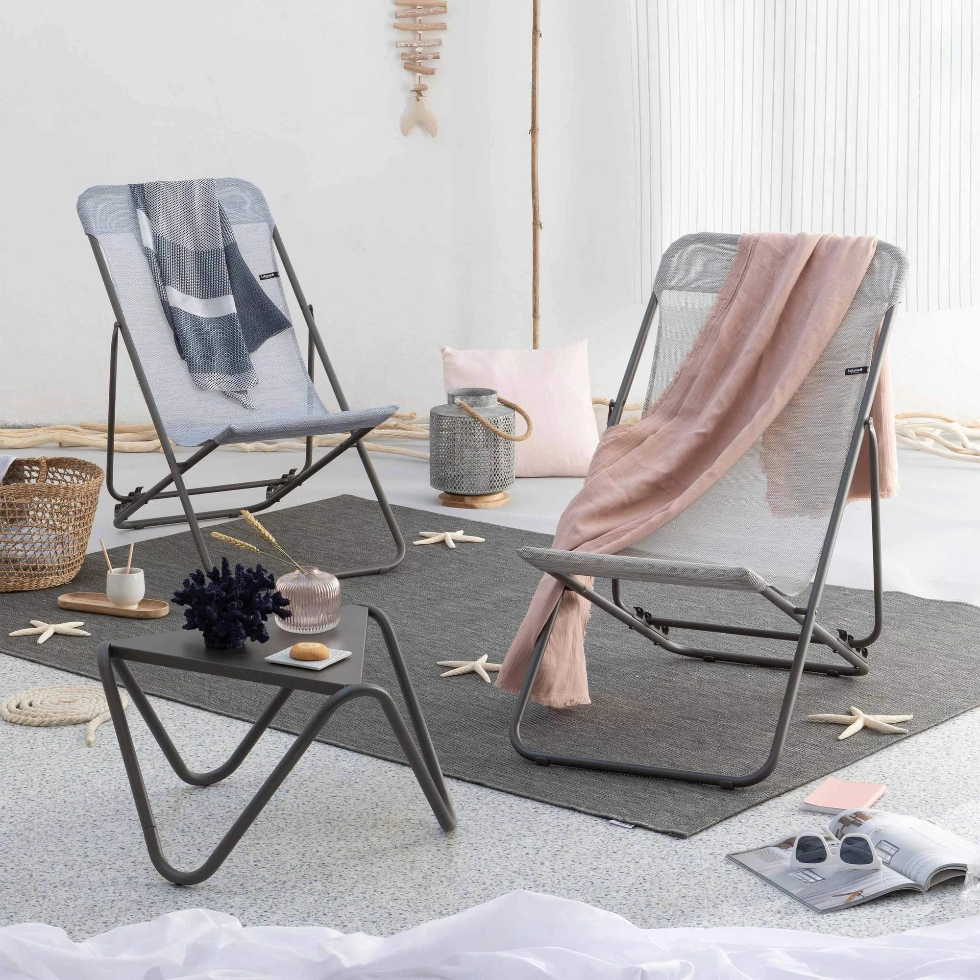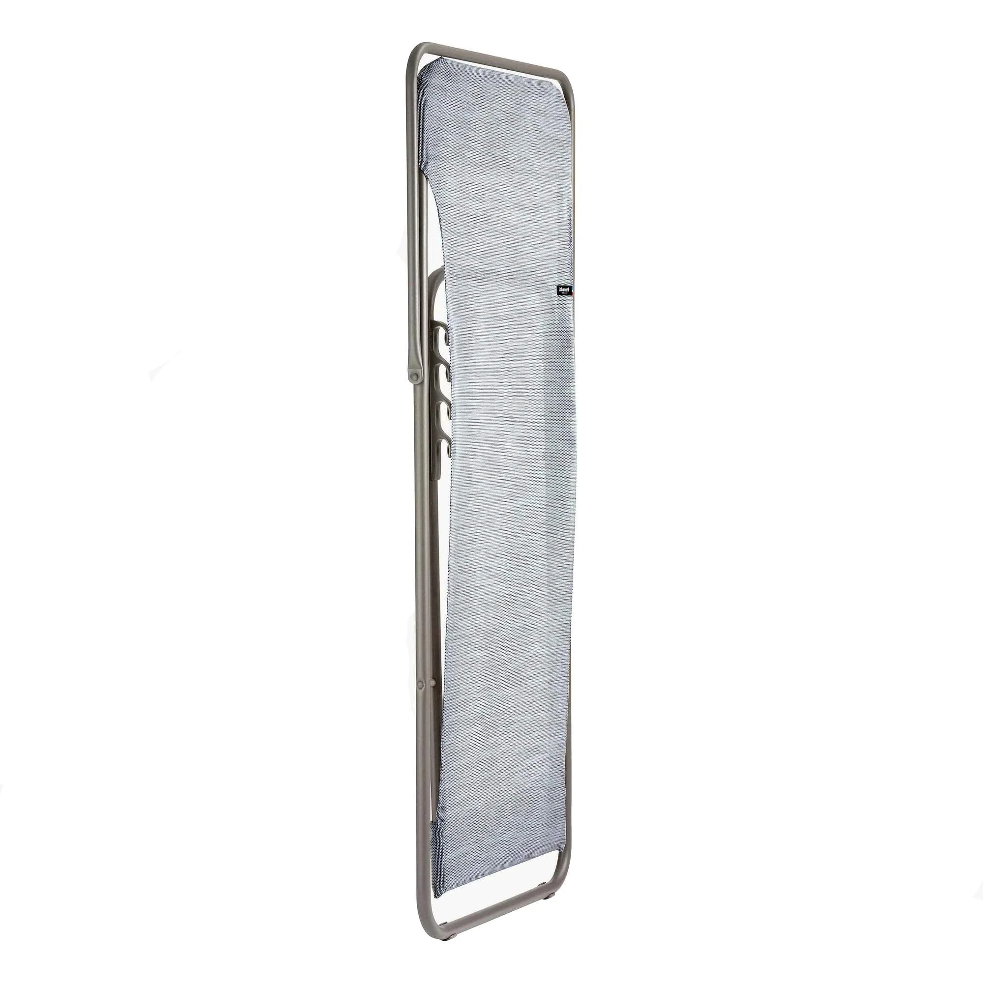 Der Liegestuhl ist sehr robust, das merkst du schon beim Hinsetzen. Das 20 mm dicke Stahlrohr ist lackiert und besitzt eine beschichtete Oberfläche. Der Batyline-Bezug ist wasserfest, leicht zu trocknen und zu reinigen. Insgesamt hat der Transatube 2 eine hohe UV-Beständigkeit. Der Stuhl lässt sich bemerkenswert flach zusammenklappen: nur noch 5 cm misst er dann. So kannst du ihn kompakt unterbringen und in allerlei Nischen lagern.