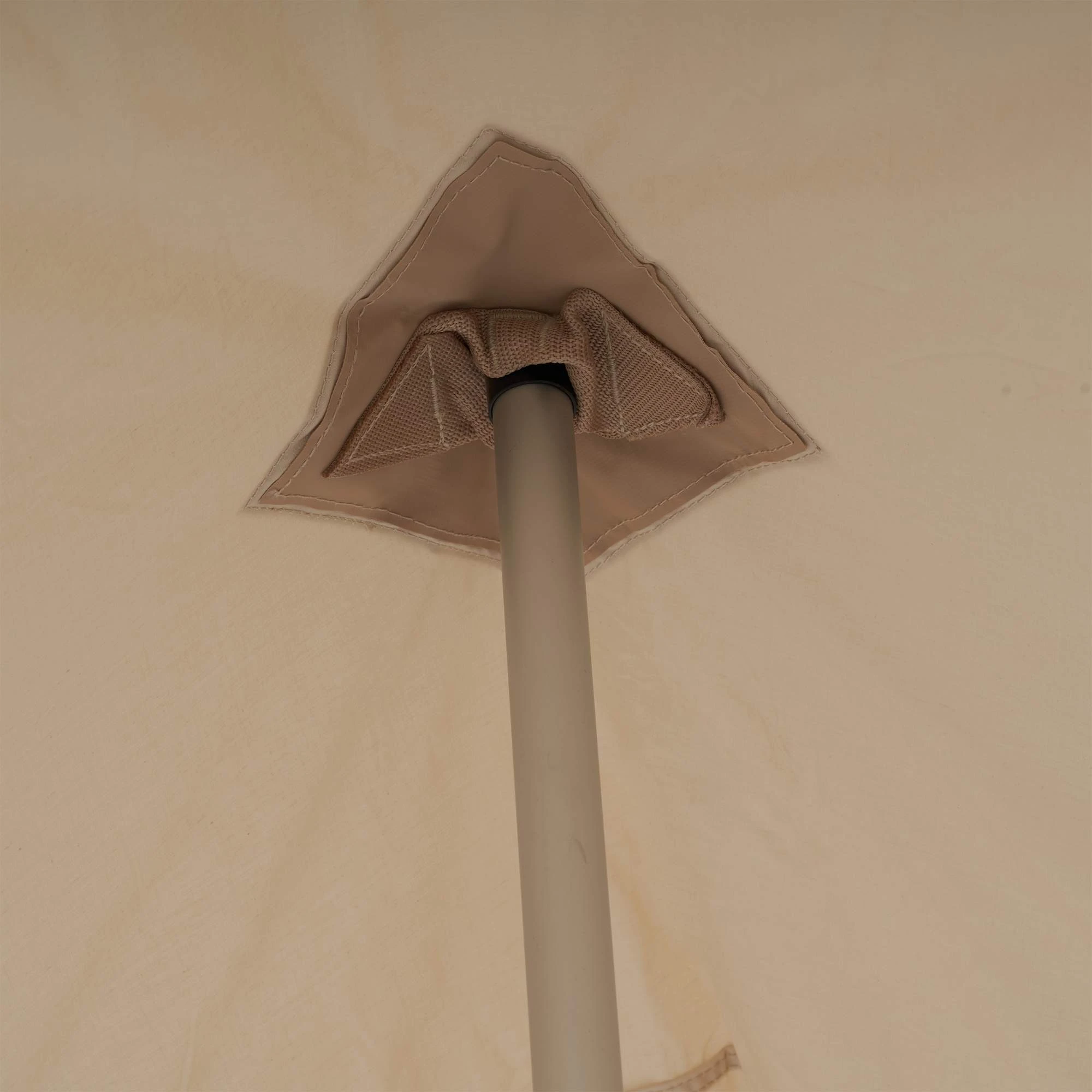 Das Baumwolltarp wird mit stabilen Aufstellstangen (höhenverstellbar) und dicken Abspannleinen mit Heringen geliefert. Dadurch kannst du es unabhängig von einem Zelt überall aufstellen. Zwei ergänzende Abspannpunkte in der Mitte des Tarps ermöglichen zudem das vertikale Abspannen, z. B. an einem Baum. Zusätzlich ist ein mit Tarpaulin verstärkter Mittelpunkt eingesetzt, indem eine zusätzliche Stange, ein stabiler Ast oder ein Paddel einem Durchhängen des Materials entgegenwirkt. Damit die Stange nicht verrutscht, ist der Mittelpunkt von einem Nylonwulst eingefasst.