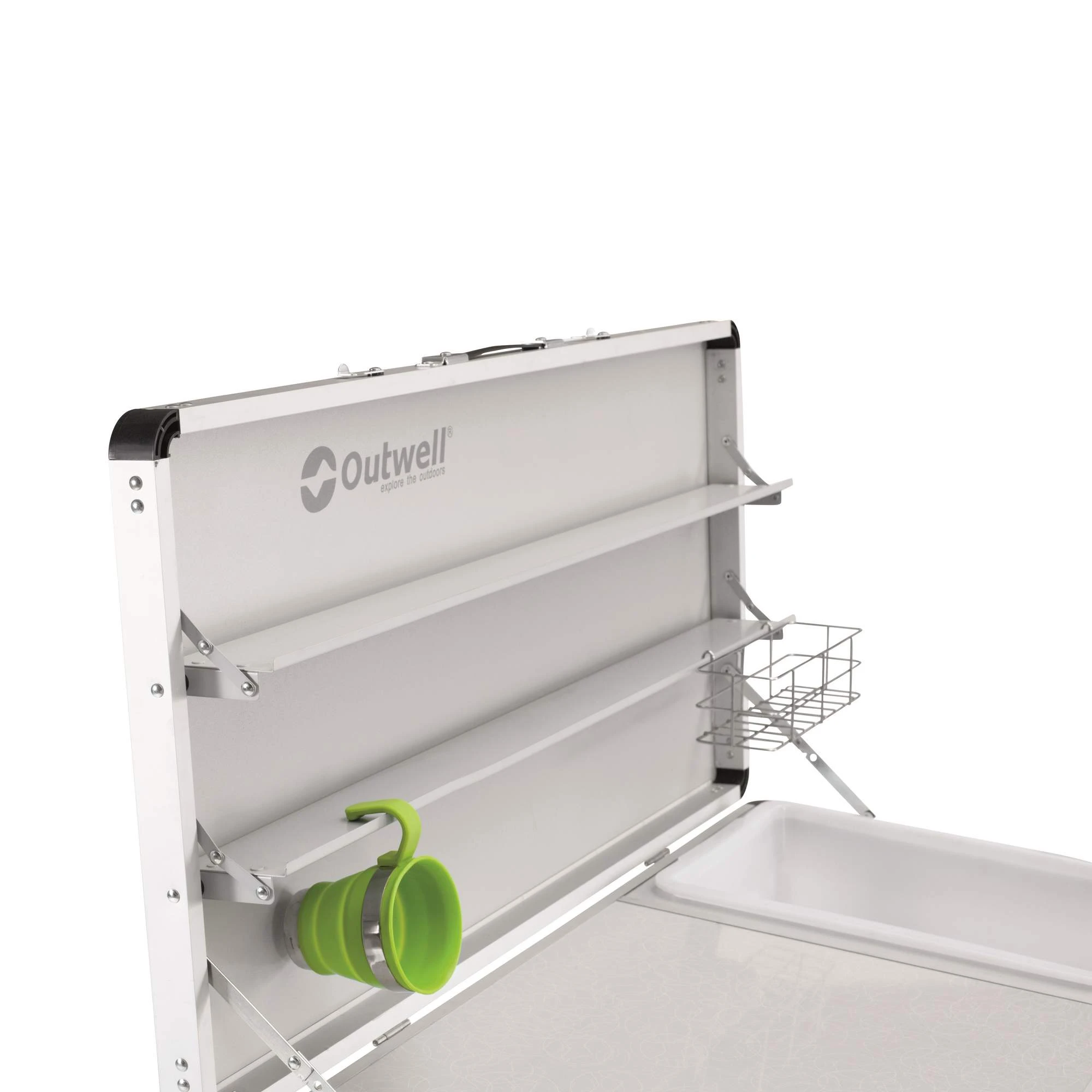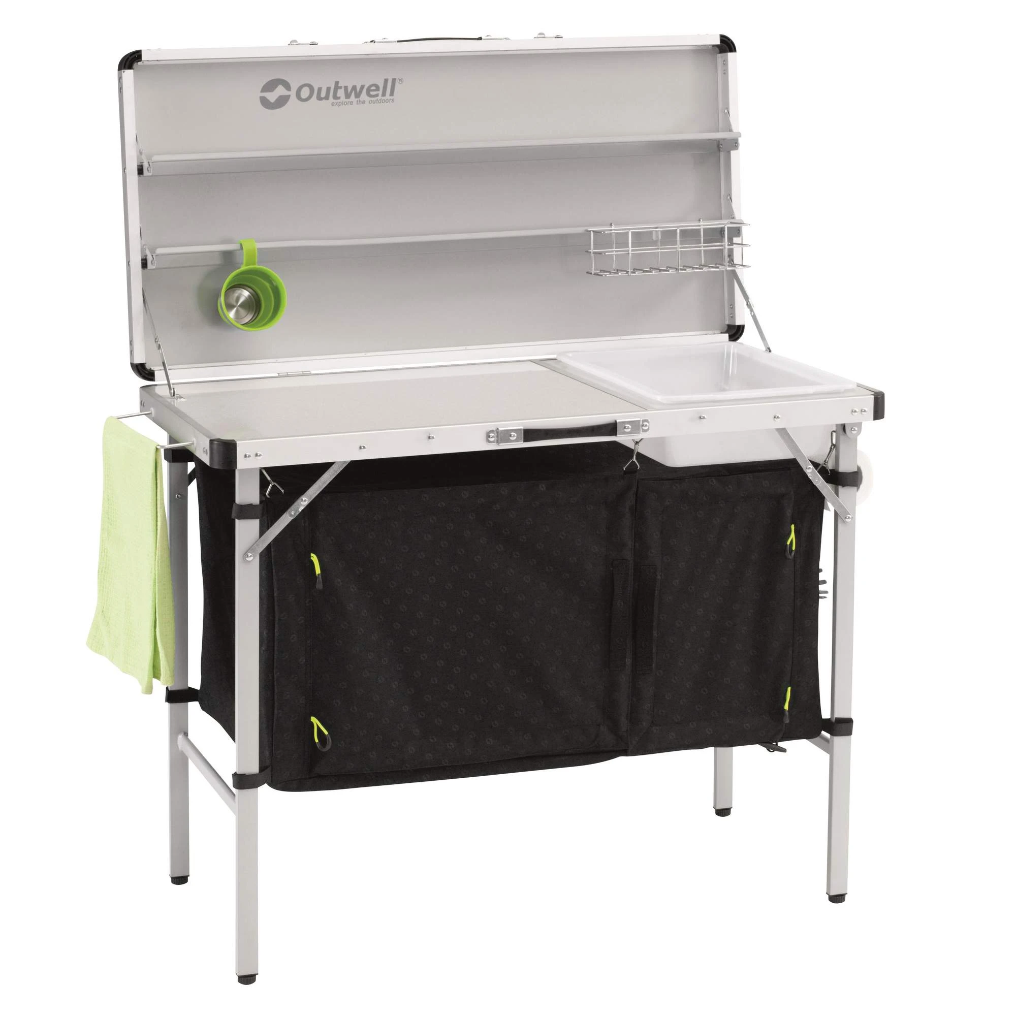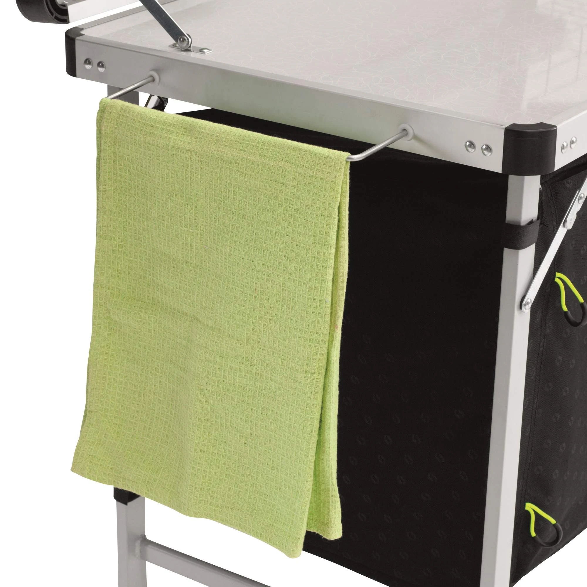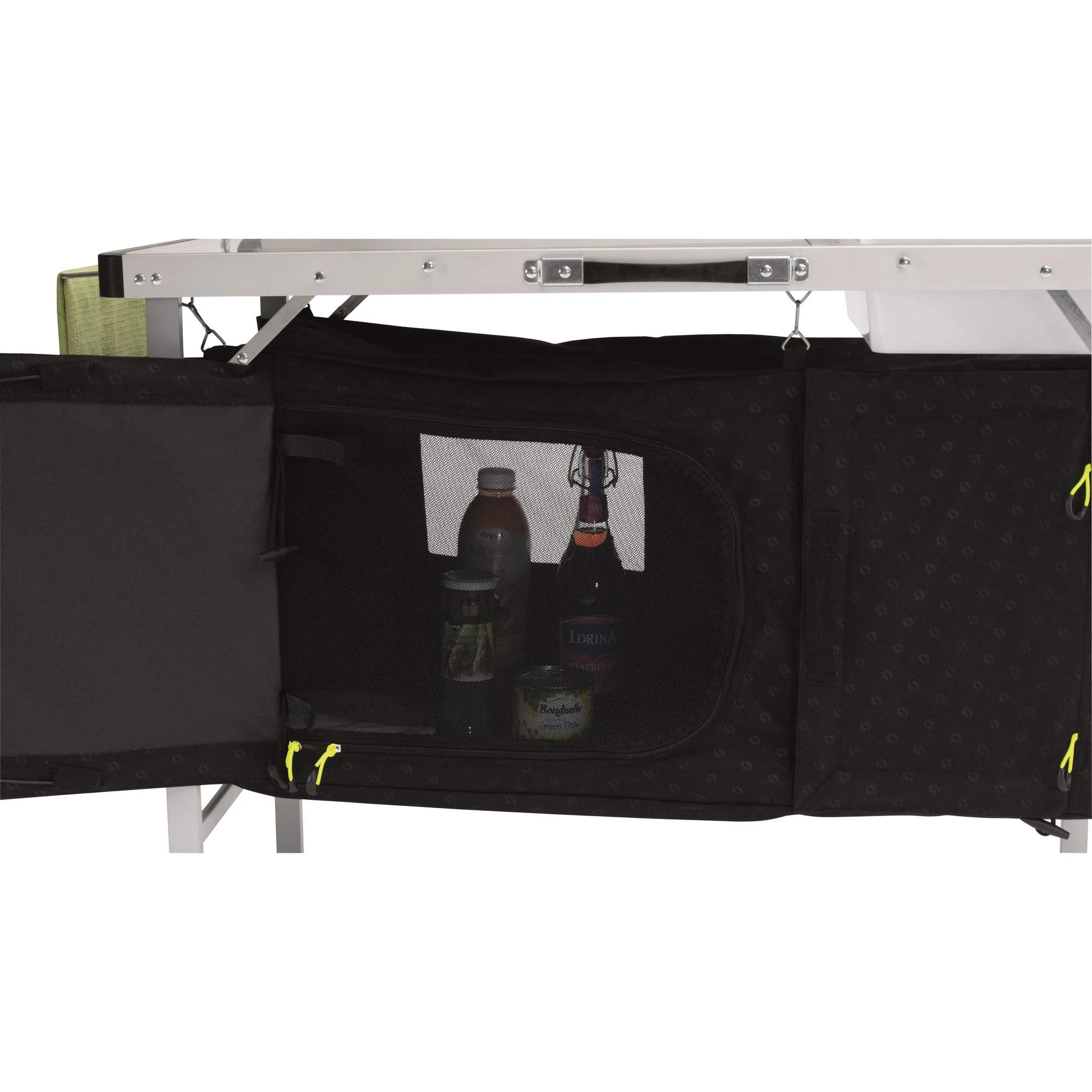 Der Drayton Kitchen Table leistet dir nicht nur als stabile Arbeitsfläche beim Kochen wertvolle Dienste, sondern kann auch noch Töpfe, Lebensmittel oder Gasflaschen unterbringen. Hinter den magnetverschlossenen Türen finden sich zusätzliche RV-Netzflächen, die Insekten von deinen Nahrungsmitteln fernhalten. Außerdem sorgen weitere Mesh-Einsätze an der Rückseite für Luftzirkulation in den Fächern.