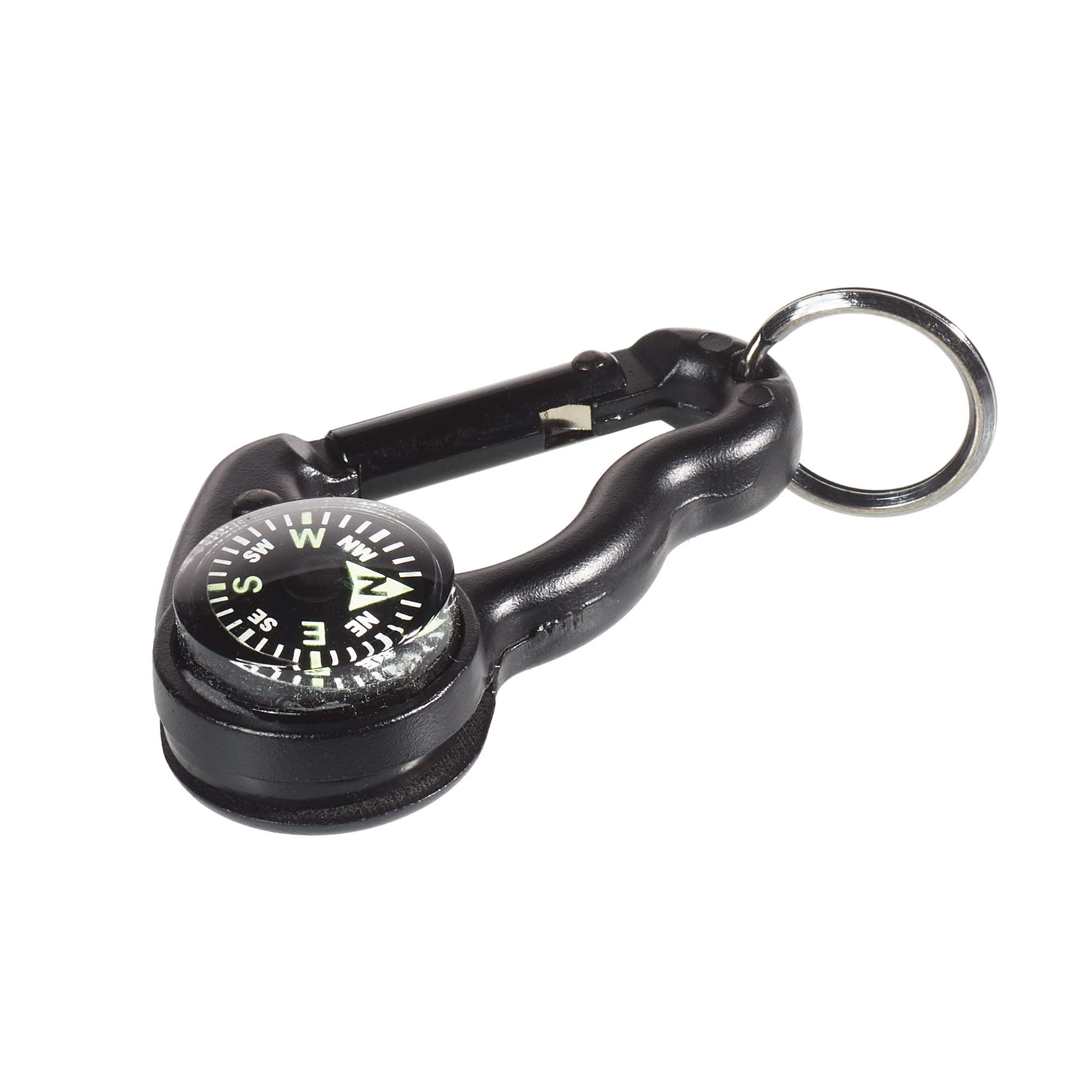 Der Aluminium-Karabiner hat zusätzlich einen Schlüsselring: Dadurch lässt sich der MagniComp vielfältig befestigen. Der Schlüsselring ist aus Messing und beeinflusst den Kompass nicht. Für sicheres Ablesen im Dunkeln ist der Kompass fluoreszierend.